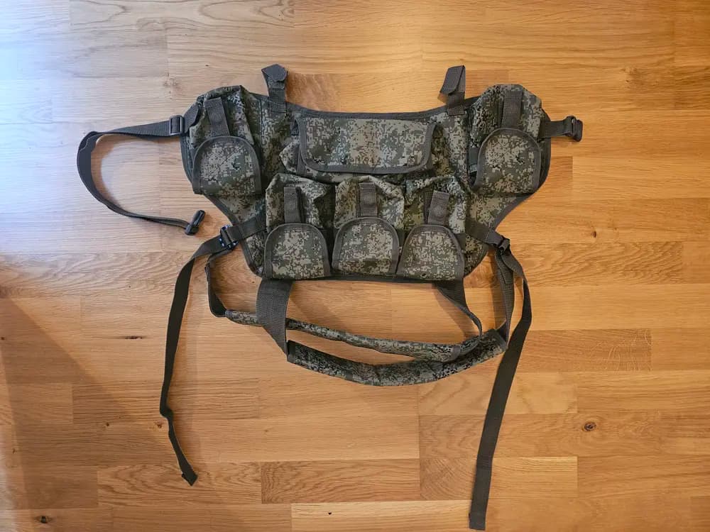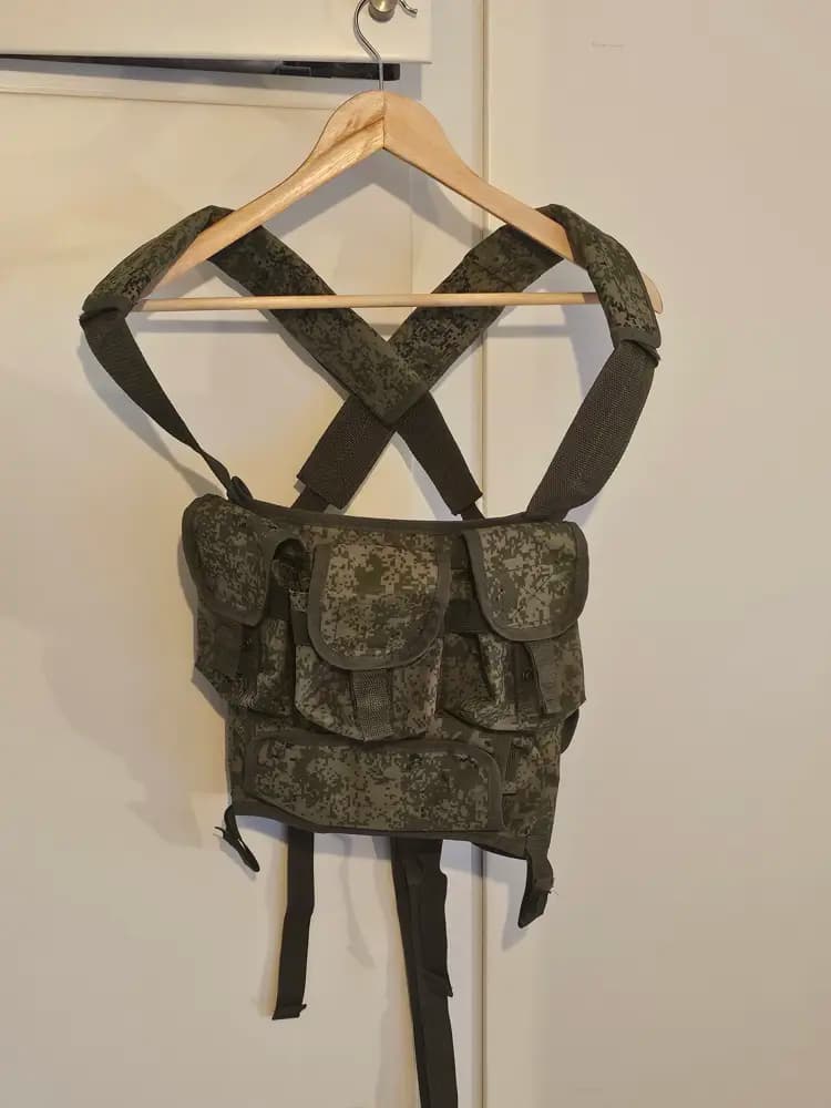 Väst anpassad för SVD magasin i EMR kamouflage.Bra justeringsmöjligheter i axlar och midja, 5 magasinfickor och en avlång magficka.