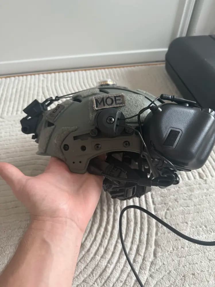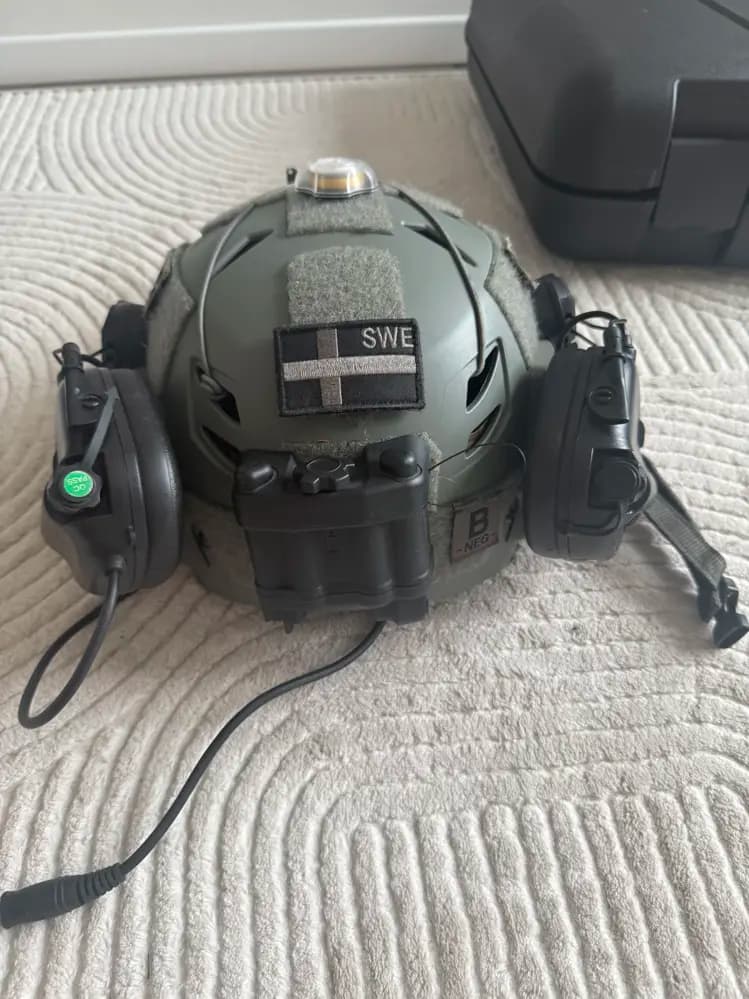 Kittad hjälm med röd markeringslampa och fullt fungerande kåpor med komminukations anordning till baofengradio. Hjälmdok medföljes vid köp storlek M