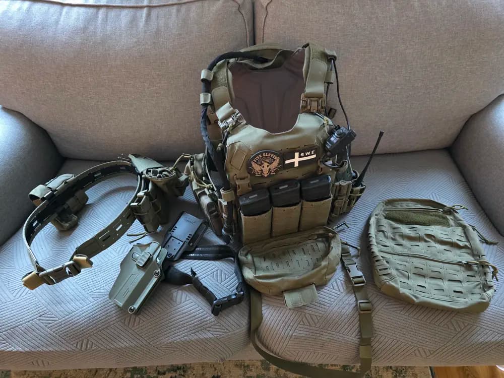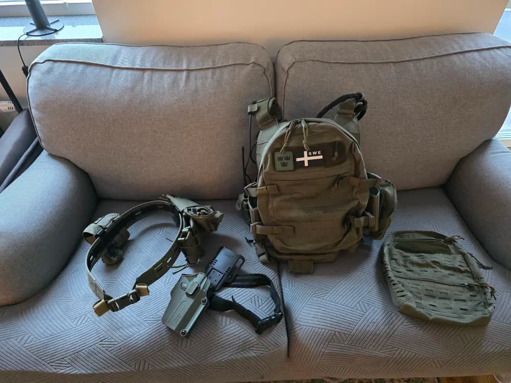 Säljer min plate carrier i strl M med 3 snabb-magasinfickor, 2 pistolfickor på västen, en multificka, en universal radioficka, en danglerpouch, H1 backpack och även H2 med kamelficka för vatten. Har också en bröstficka för gps/mobil som inte sitter på. Sitter även en baofeng radio med PTT. Bältet PT6 strl L inklusive innerbälte har en dumpficka, drophölster, 2 pistolfickor, AR ficka, 2 granatfickor och en flashbangficka.Har diverse fler fickor som inte sitter på.Allt säljs i ett kit.