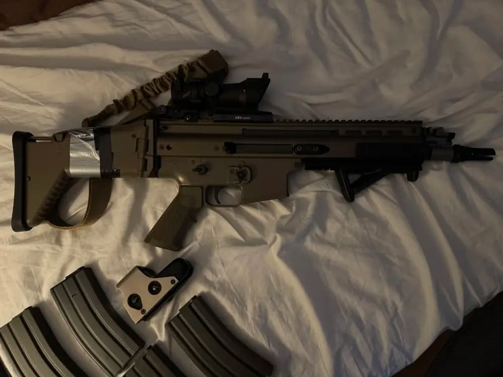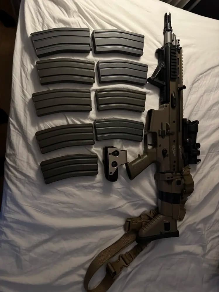 En Tokyo marui scar l med 9 magasin samt två olika sikten. Har inte använts på några år så tänkte att det är dags o sälja av istället för att de ska samla damm här hemma. Senast jag spelade krånglade det lite mellan auto och semi att semin inte riktigt ville hoppa i alla gånger annars fungerade den felfritt.Pris ej satt i sten utan kan gå ner vid smidig och snabb affär. Finns i Örebro eller skickas.MVH// Gabriel