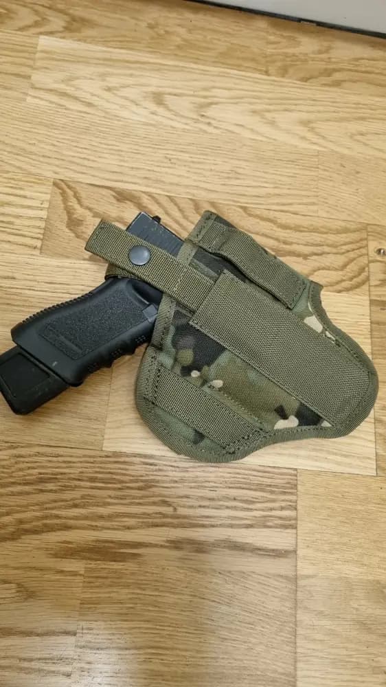 Universal pistol holster som man bär på bälten. Säkringen är justerbar.