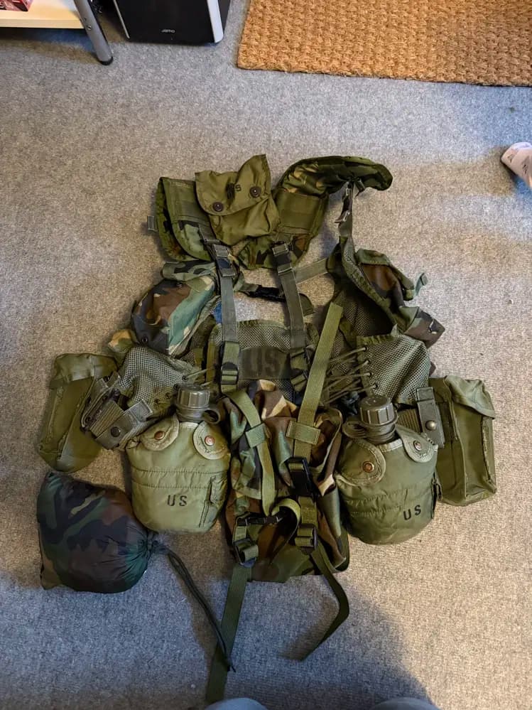 Stålhjälm jacka xl, byxor xl, stridsväst med 2 vattenflaskor, woodlandponcho, magasinfickor mm. boots strl 44