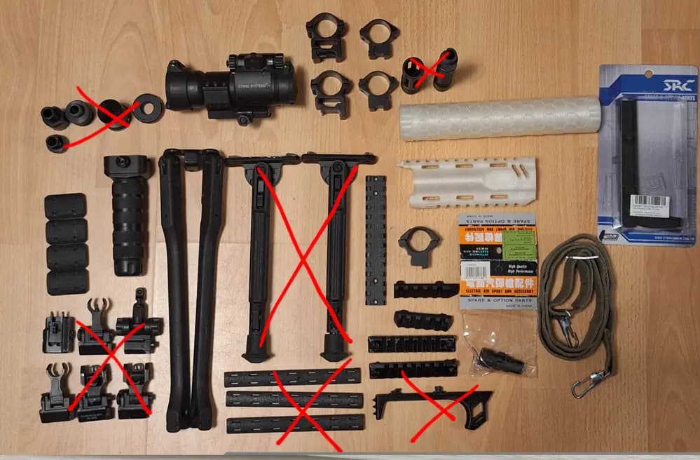Olika tillbehör, adaptrar, ak sling mmStrike systems siktet funkar men batterier glappar, är du händig kan det nog fixas.Har flera annonser, köp gärna flera😉Grejerna säljes generellt inte styckesvis men om det verkligen är något enskilt du behöver går det kanske att lösa.Sammlingen har legat i källaren länge och har ingen aning om vad som funkar och inte. Förvänta dig för mycket så blir du inte besviken.Byten kan vara intressant. Airsoft relaterade, m4 aeg, gbbp exempelvis.Kan postas om du är villig att stå för frakten och betala innan det skickas.
