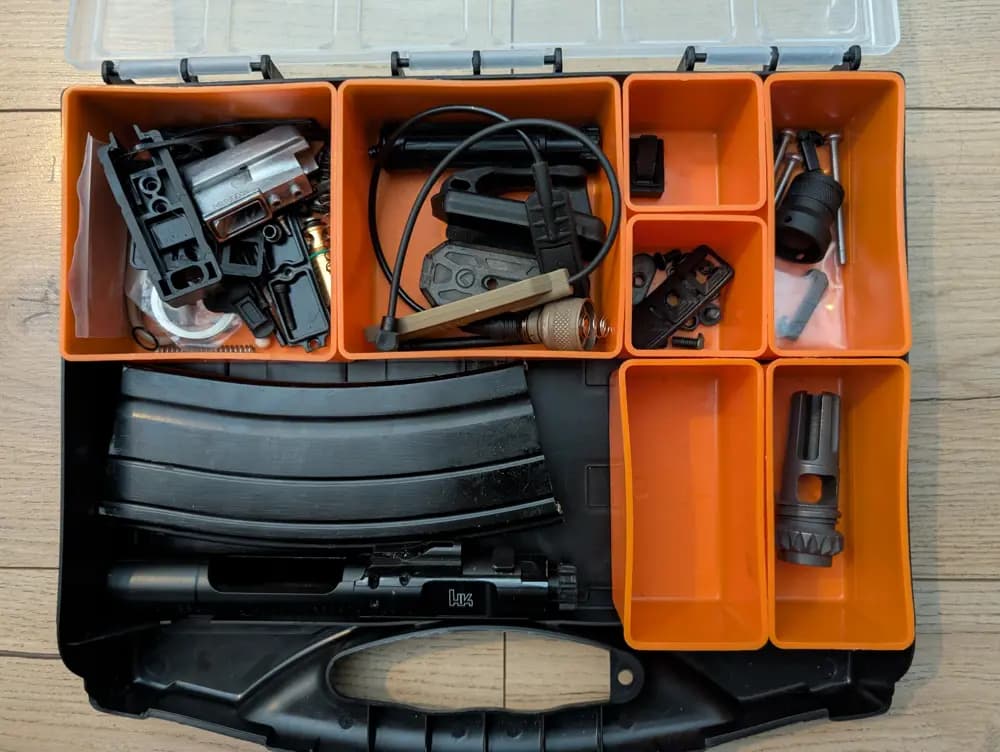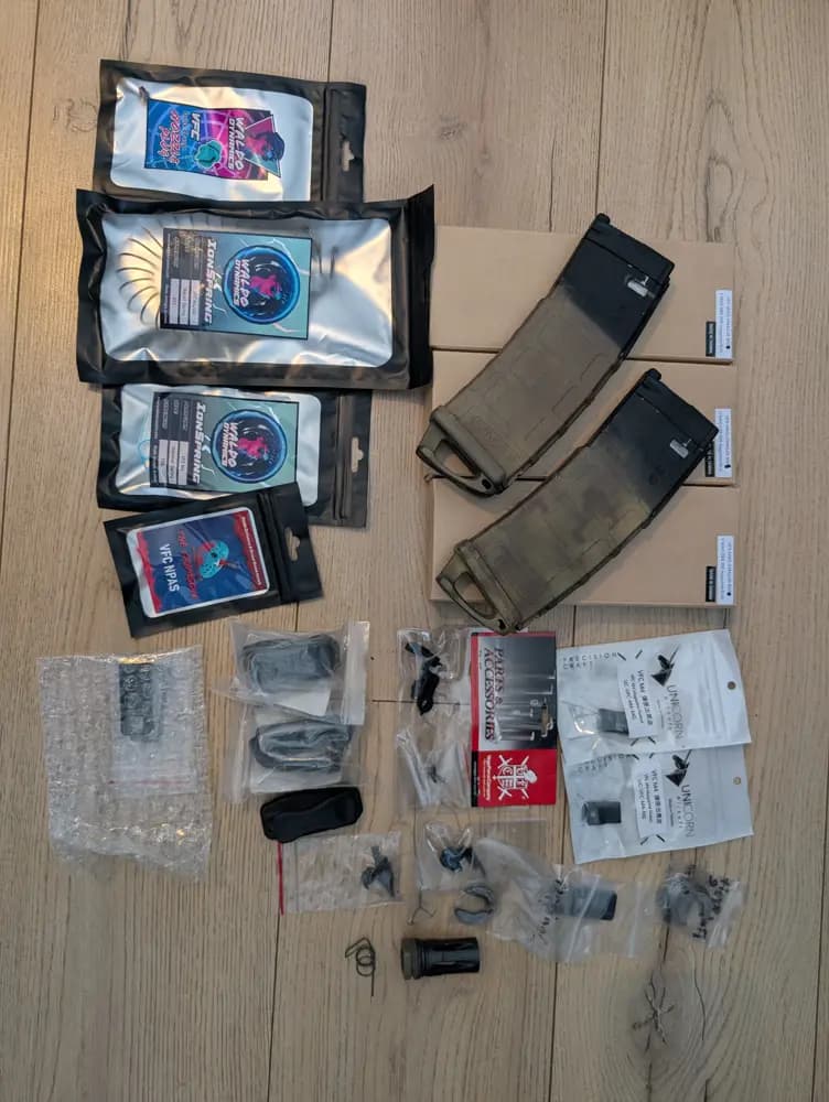 Medföljer en hel del extra delar/reservdelar tex 1 extra boltcarrier med nozzle, en lös nozzle, eldväljare och diverse packningar osv till magasin