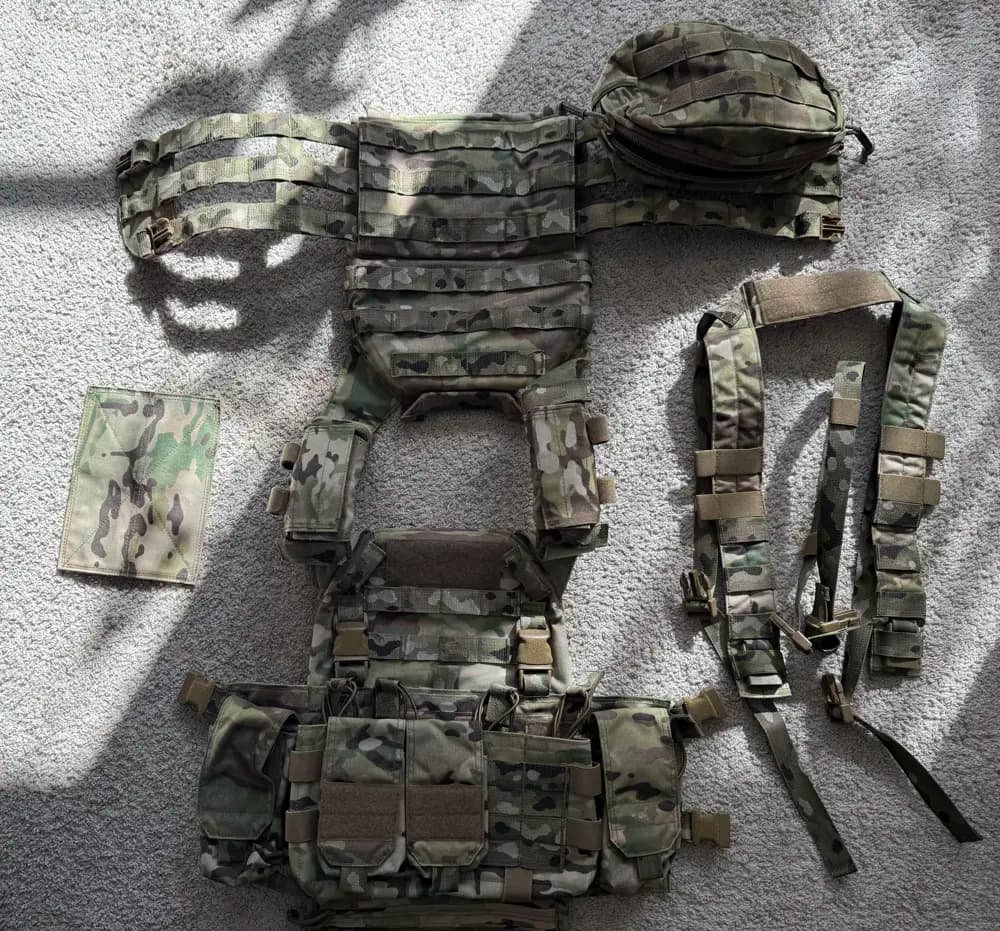 Här har vi en was Platecarrier med en chestrig som placard och en drop pouch och utility pouch jag använder mina saker så det är nötningar men ingenting är trasigt.