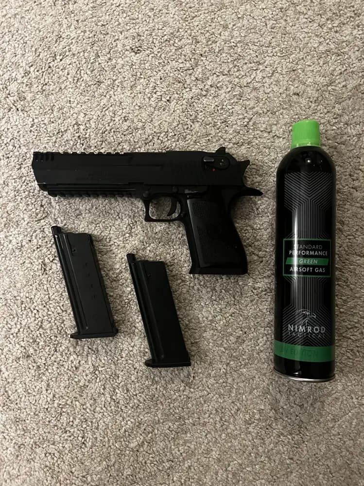 Säljer en kraftfull och realistisk Desert Eagle från WE. En riktigt tung och gedigen pistol i full metal med stark blowback och bra känsla i handen.Ingår:WE Desert Eagle L6 .50 AE Full Metal GBB Black2 magasin (ena behöver nya O-ringar and fungerar perfekt)Green Gashttps://www.frysenairsoft.se/vapen/we-desert-eagle-l6-50-ae-full-metal-gbb-black/Ord Pris 3899krMitt Pris 1999krKontakta vid intresse eller frågor.